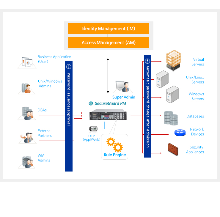 SecureGuard PM is a professional password management solution for large-scale data centers. Through self-developed rule engine, it provides effective password management for various platforms and devices. By changing password in a batch or issuing a one-time password, it provides a secure password management environment.