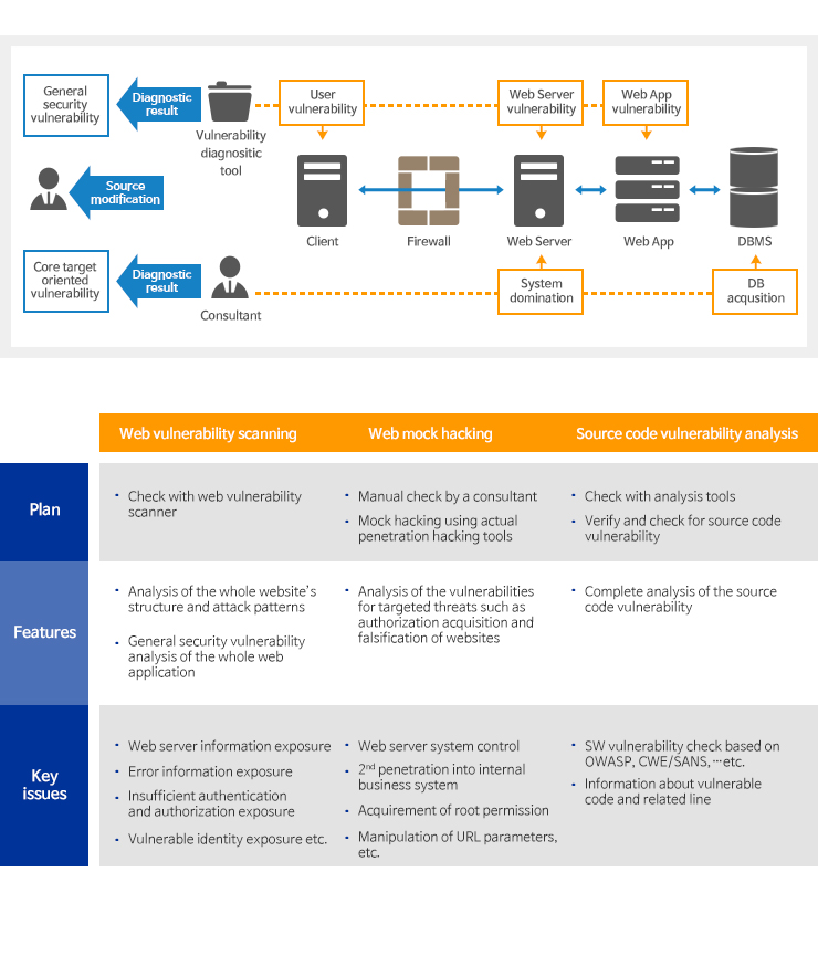 BigLook performs vulnerability scanning for source code to strengthen the application security. It offers various functionalities such as authority control for developers and management for changing history to secure coding. As the source code security management system, Big Look Server supports comprehensive security functionalities of the entire application development life cycle such as a plan, development and run.
