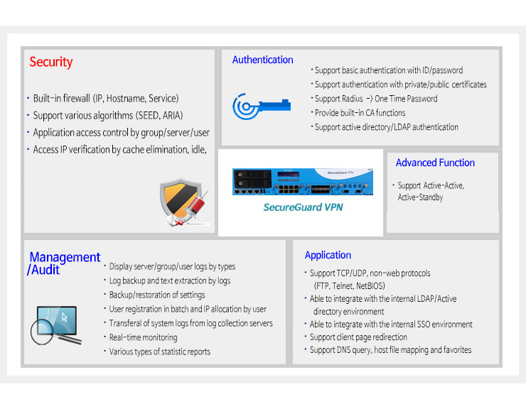 SecureGuard VPN is an SSL VPN device developed with SSL web-standard encryption and proxy technology to provide a secure remote access to an internal network through a public network such as the internet.