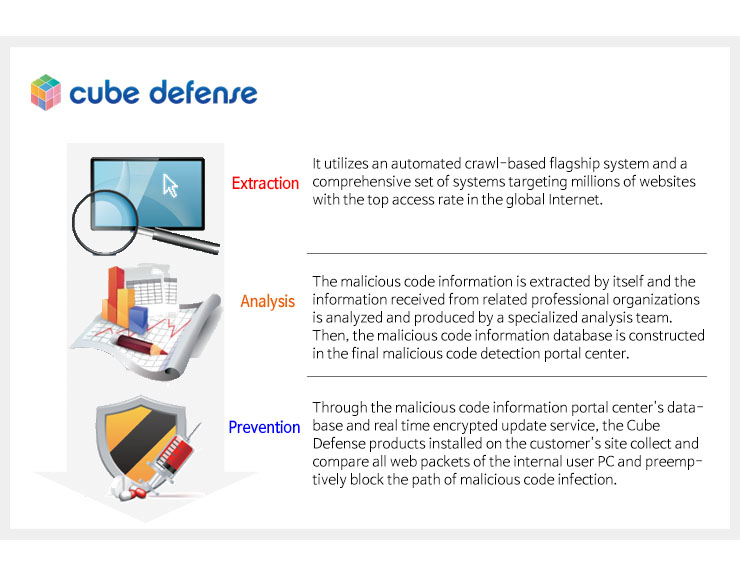 Cube Defense, the system against malicious code infections, collects all packets without installing a separate agent on the user's PC and compares malicious code information portal with real time updated malicious code information database. When accessing landing or distribution websites it provides precise blocking based on "Full URL" that blocks only the files infected by malicious code without blocking "whole pages".