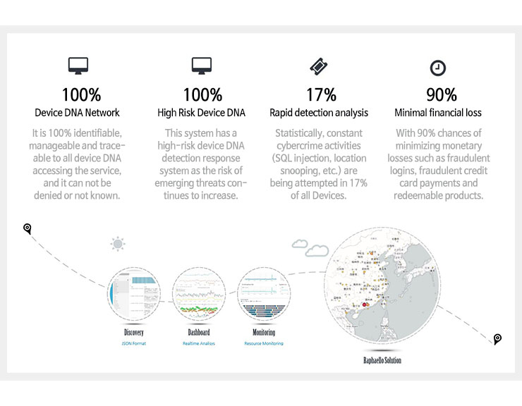 Actions of cyber criminals are always performed based on Devices. Through identifying and analyzing Devices, it is a system that grasps the intentions of cyber criminals and responds. In other words, based on "multiple device authentication" and "fraud prevention technology", the machine learning based Raphaello system detects cyber-criminal activities in real time and by responding with "block", it provides the highly safe service based on Frontend.