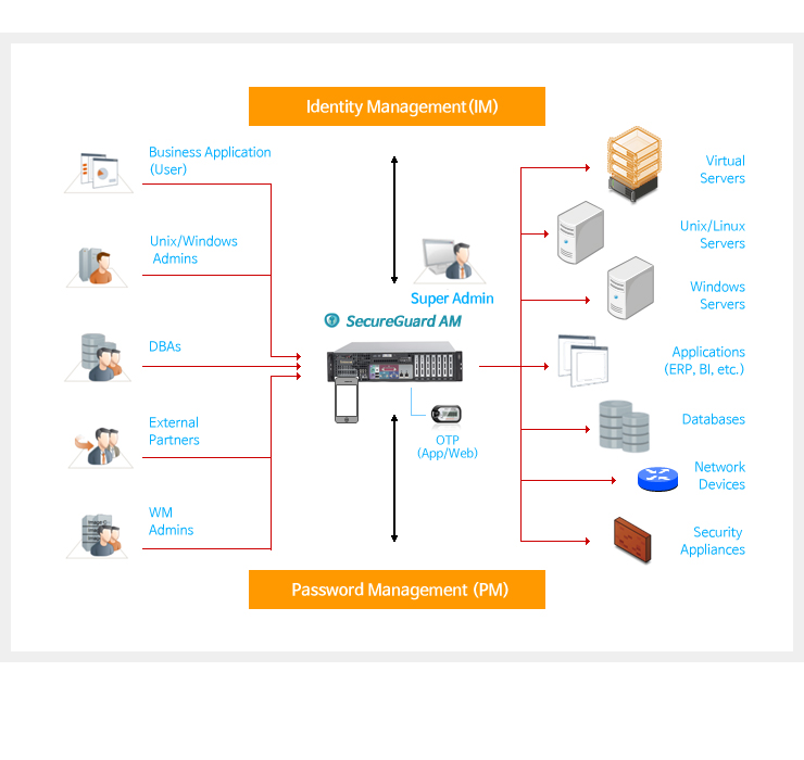 SecureGuard PM is a professional password management solution for large-scale data centers. Through self-developed rule engine, it provides effective password management for various platforms and devices. By changing password in a batch or issuing a one-time password, it provides a secure password management environment.