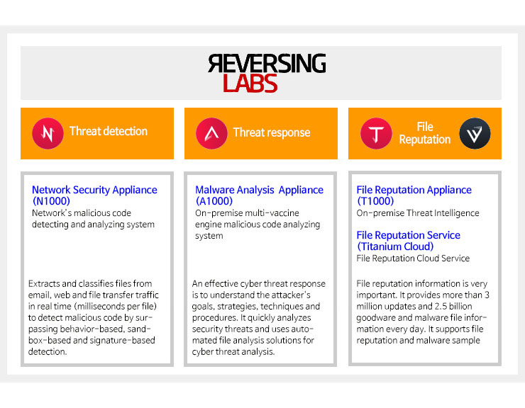 ReversingLabs deals with limitation on the existing sandbox technology. As the most innovative and advanced malicious code detecting and analyzing solution, thanks to the ADF (active file decomposition) technology, it extracts internal objects and file indicators without their execution. It also provides analysis of the biggest number of files and the most malicious code information through cloud service.